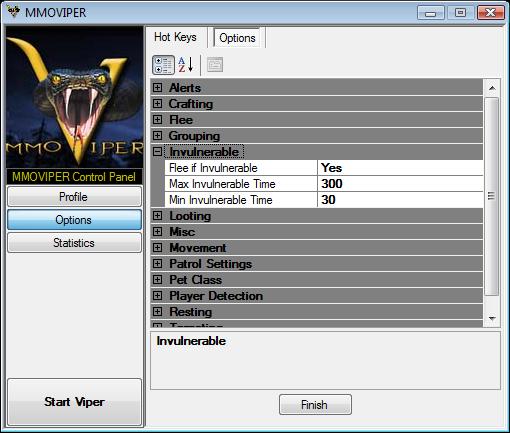 1.   "Flee if Invulnerable" - Check this box if you want your character to flee from a mob it can not damage in combat. This option has 2 changeable settings.